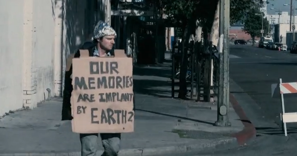 A tinfoil hat-wearing conspiracy theorist (or synchromystic?) in movie says that Earth 1 (our Earth) is actually a projection of the minds of the inhabitants of Earth 2.